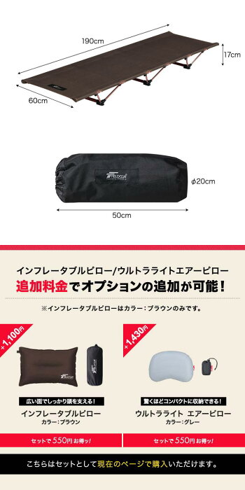 1年保証 アウトドアコット 190 x 60cm 軽量 アルミ コット コンパクト ベッド 折りたたみ ローコット ベンチ チェア イス 枕 ピロー アウトドア キャンプ 簡易ベッド キャンプ用 寝具 アウトドア用寝具 アルミコンパクトコット FIELDOOR ●[送料無料]
