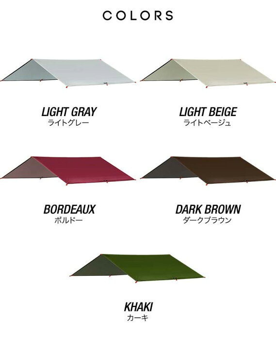 シーンに合わせてレイアウトを楽しめるレクタタープ FIELDOOR レクタタープ 435x500cm【4カラー】 商品詳細 (レクタタープ)ブランドフィールドア(FIELDOOR)カラー・ライトグレー・ボルドー・ダークブラウン・カーキサイズ本体 : (約)435cm×500cm収納時 : (約)51cm×28cm重量(約)2kg材質75D 190T ポリエステル耐水圧2,000mm以上付属品・本体×1・ペグ×8・ロープ×8・収納バッグ×1・取扱説明書(日本語)商品詳細 (スチール製テントポール)ブランドフィールドア(FIELDOOR)サイズ(約)φ2.5cm×246cm(有効長 : (約)240cm)材質スチール重量(約)3.2kg(1セットあたり)商品詳細 (アルミテントポール280)ブランドフィールドア(FIELDOOR)カラー・レッド×2サイズテントポール : (約)φ3.2cm×126cm〜286cm (有効長 : (約)120cm〜280cm)収納バッグ : (約)70cm×12cm×12cm材質テントポール : アルミ A6061(アルマイト加工)収納バッグ : ポリエステル重量(約)1.3kg(1セットあたり) MADE IN CHINA ※商品は、モニターによって色合いが異なって見える場合があります。
