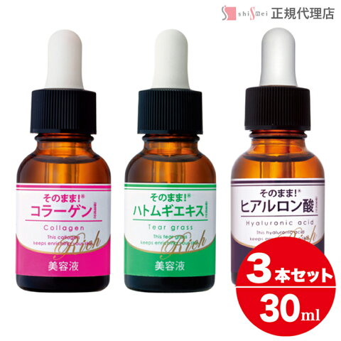 商品共通詳細 商品名 ハトムギエキス原液「そのまま!ハトムギエキス〈Rich〉」×1本ヒアルロン酸原液「そのまま!ヒアルロン酸〈Rich〉」×1本コラーゲン原液「そのまま!コラーゲン〈Rich〉」×1本 内容量・容器 各30mlガラス/スポイト仕様 ご注意事項 高温多湿・直射日光が当たる場所を避けて保管ください。