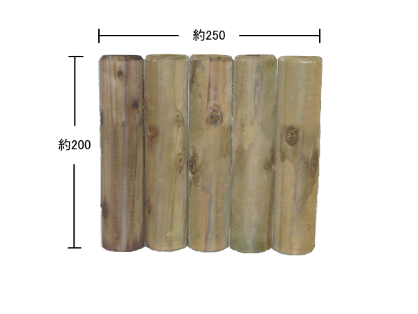 仕様 防腐防蟻処理(ACQ加圧注入) 約長さ200mm×φ50mmの丸太5本をステンレスボルトで連結しています。